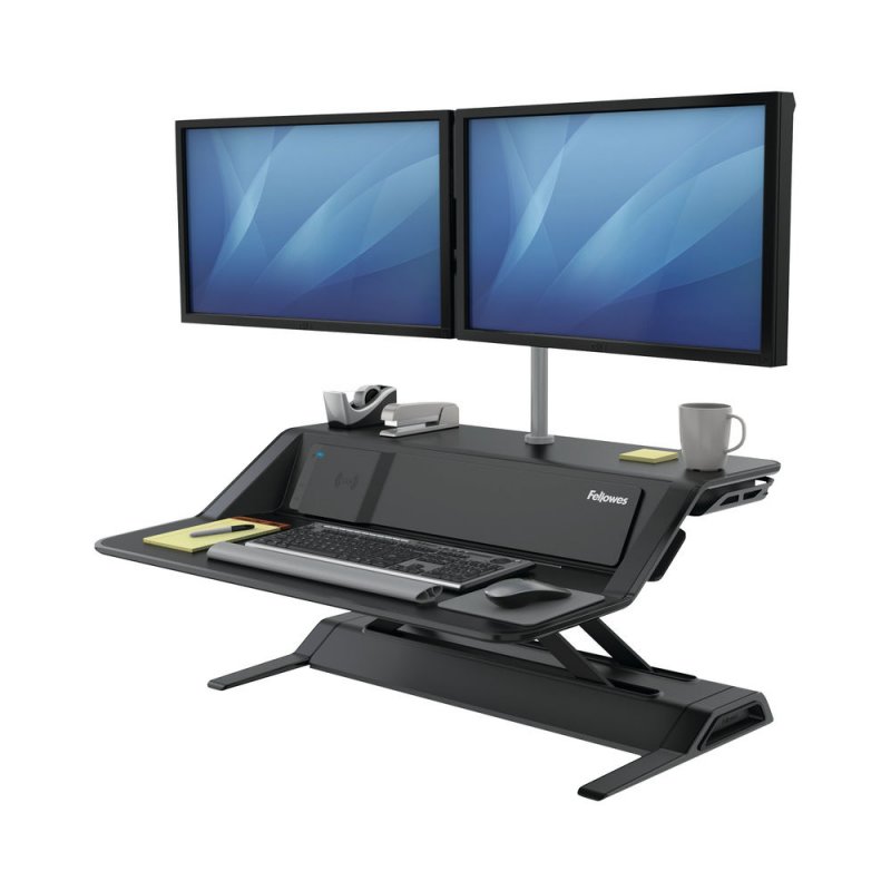 Fellowes Lotus DX Sit-Stand Workstation in Black The Fellowes Black Lotus DX Sit-Stand Workstation takes your workspace to the next level with a built in charging station featuring wireless charging capabilities to allow effortless produ...